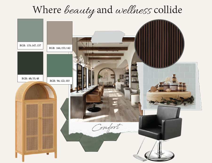 LaVonne’s salon is a new build commercial project that encompasses skills I have learned over my two years at Western. Within this capstone project we had budget constraints, a real site location, and a client to work with. For this project, I was building a dream salon for my client if she were to expand her services from her current location. With the salon’s site being in a small community I leaned into that when designing. Making sure my design accommodated for her wide age range of clientele, felt calming, and not too modern.